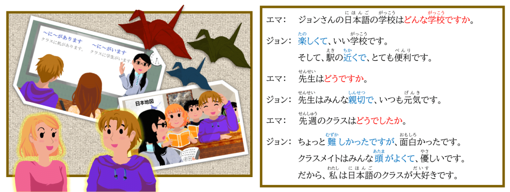 エマさんはジョンさんの日本語(にほんご)の学校(がっこう)について (about…) 聞(き)いています。