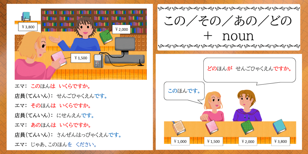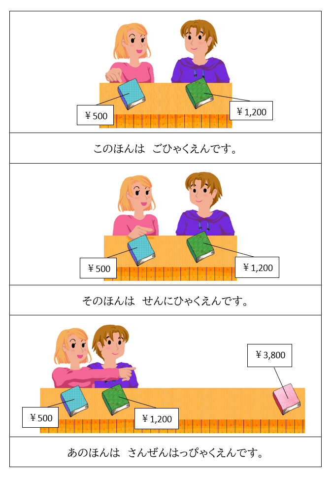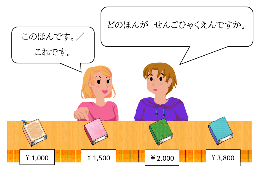「ほんは せんにひゃくえんです」と言(い)っても、どれが1200円(えん)の本(ほん)かわかりません。でも、「これほん」「それほん」「あれほん」は間違(まちが)いなので言(い)えません。