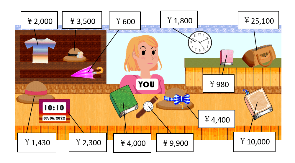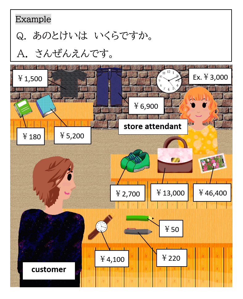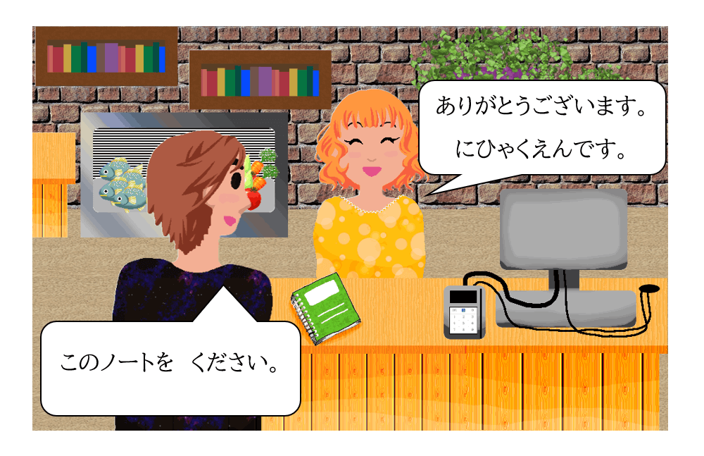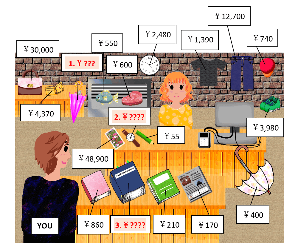 今回(こんかい)は、値段(ねだん)を聞(き)く練習(れんしゅう)をたくさんしました。もういろいろな物(もの)の値段(ねだん)が聞(き)けますね。でも、値段(ねだん)を聞(き)くだけで買(か)い物(もの)はできません。