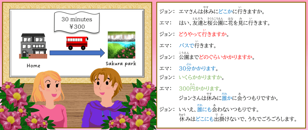 質問(しつもん)は「(place A) から (place B) まで (means) で どのぐらいかかりますか」と聞(き)きましょう。