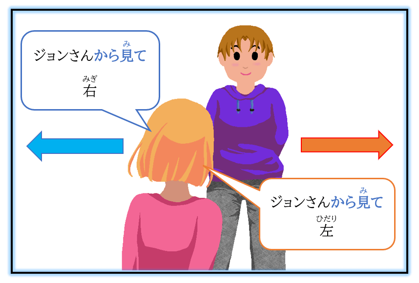 So, if you want to clearly express that you are indicating the right/left of the other person, you can add the phrase (someone) から見(み)て (from (someone)’s point of view) and say (someone) から見(み)て右(みぎ)/左(ひだり) for clarity.
