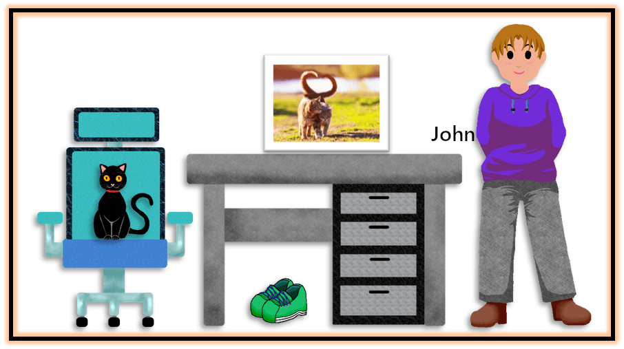 | 例(れい): 机(つくえ)の上(うえ)に本(ほん)があります。 | 例(れい): 机(つくえ)の下(した)に猫(ねこ)がいます。 |