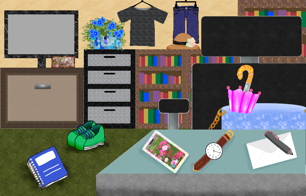 まず、一人(ひとり)が自分(じぶん)の部屋(へや)にある物(もの)を、今回(こんかい)勉強(べんきょう)した文型(ぶんけい)を使(つか)って言(い)います。