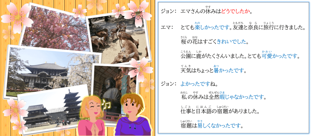 疑問詞(ぎもんし)の「どう」を使(つか)った質問(しつもん)には、「い-adjectiveかったです/な-adjectiveでした」で答(こた)えます。