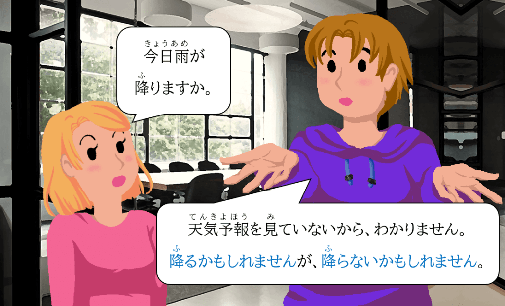 可能性(かのうせい)が50%ぐらいなので、「そうかもしれないし、そうじゃないかもしれない」のように、肯定形(こうていけい)と否定形(ひていけい)を一緒(いっしょ)に使(つか)って言(い)うこともあります。