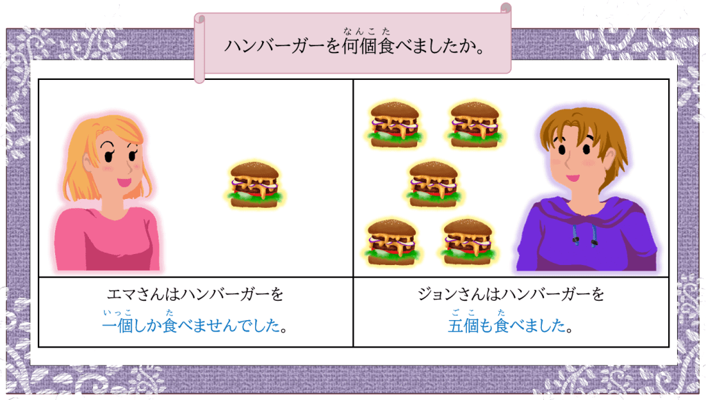 | 第二版(だいにはん) | 58ページと59ページ: 5 number + も / number + しか + negative |