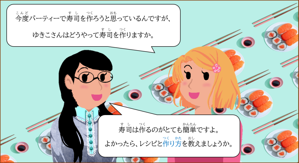 今回(こんかい)は、verb stem と「方(かた)」を組(く)み合(あ)わせて、何(なに)かをする方法(ほうほう)を表現(ひょうげん)する文法(ぶんぽう)を練習(れんしゅう)します。